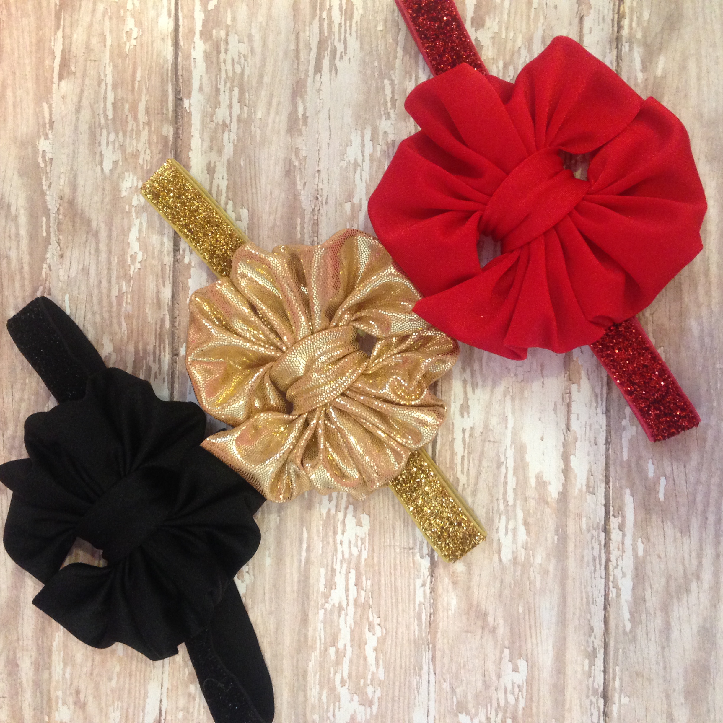 Set includes three 4" messy bows on 5/8" glitter elastic in the picture (black, red, and gold). These are 2" smaller than the regular messy bows. *ships in 2 weeks.