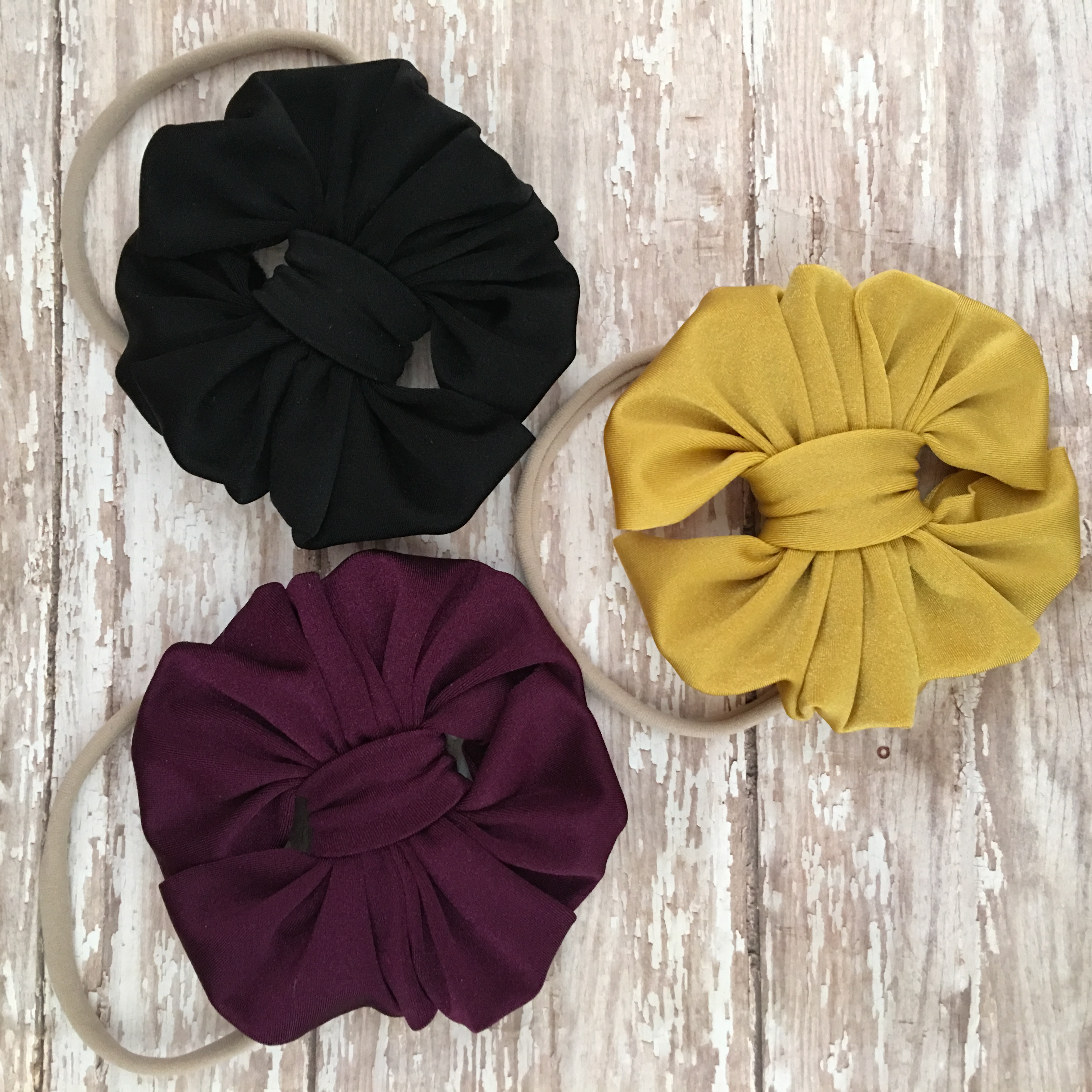 4" bows on nylon band fits infants- child Pick your favorite 3 and leave color choices in notes.