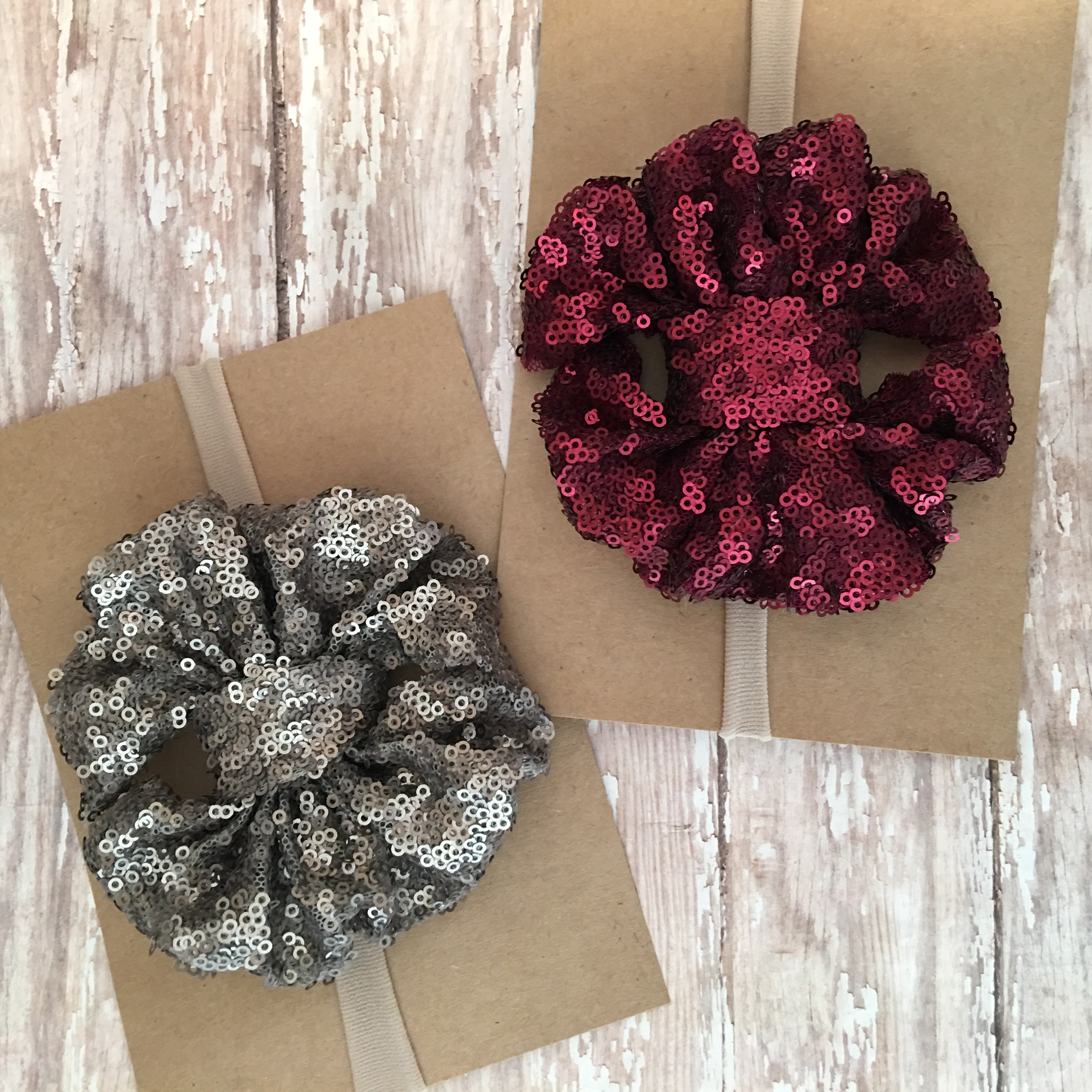 4" bows on nylon band fits infant-child. Includes set of 2 burgundy sparkle and charcoal sparkle.