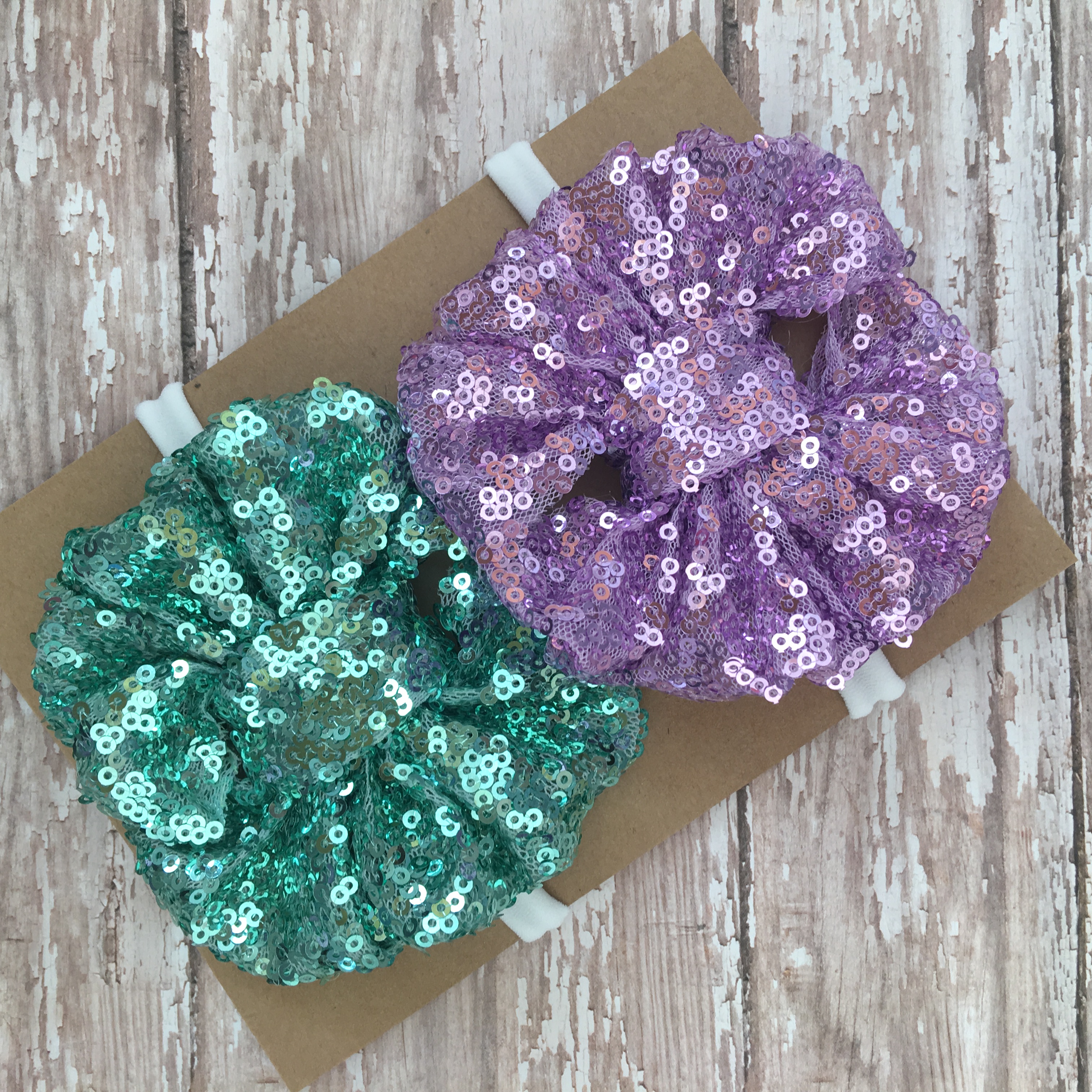 4" bows on nylon band fits infant-child. Includes set of 2 Mint sparkle and Lavender sparkle on white nylon bands